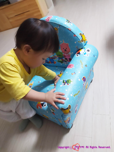 유독 뽀로로 소파의 등받이 부분 캐릭터들에 대해 관심을 갖네요.