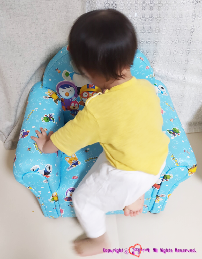 팔걸이, 등받이 부분은 푹신함이 덜하고 딱딱하여 아이가 바른자세로 앉게끔 자세고정에 좋음.