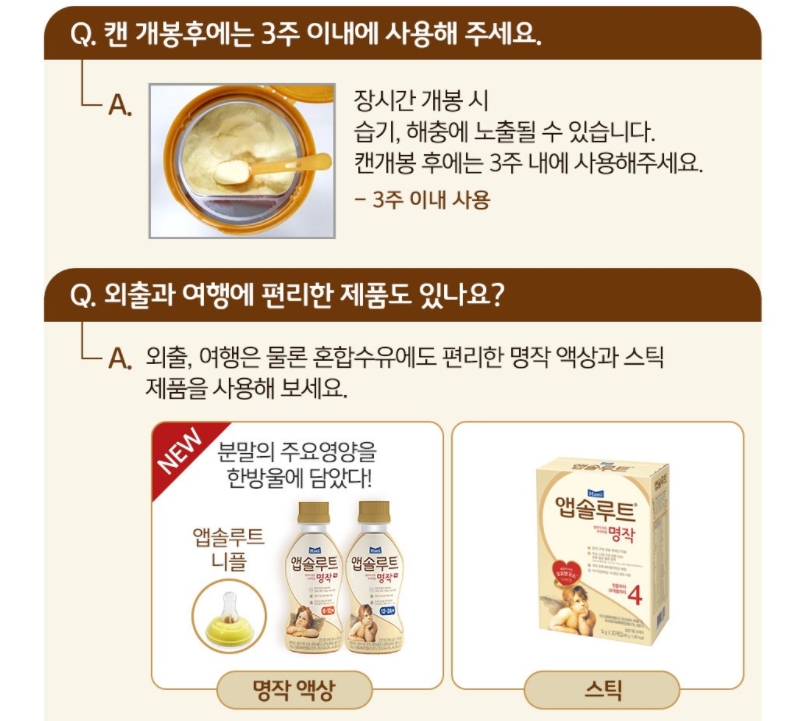 - 제품 관련 사이트 : 앱솔루트 엄마가 만든 프리미엄 명작 스틱분유(4단계) 바로가기