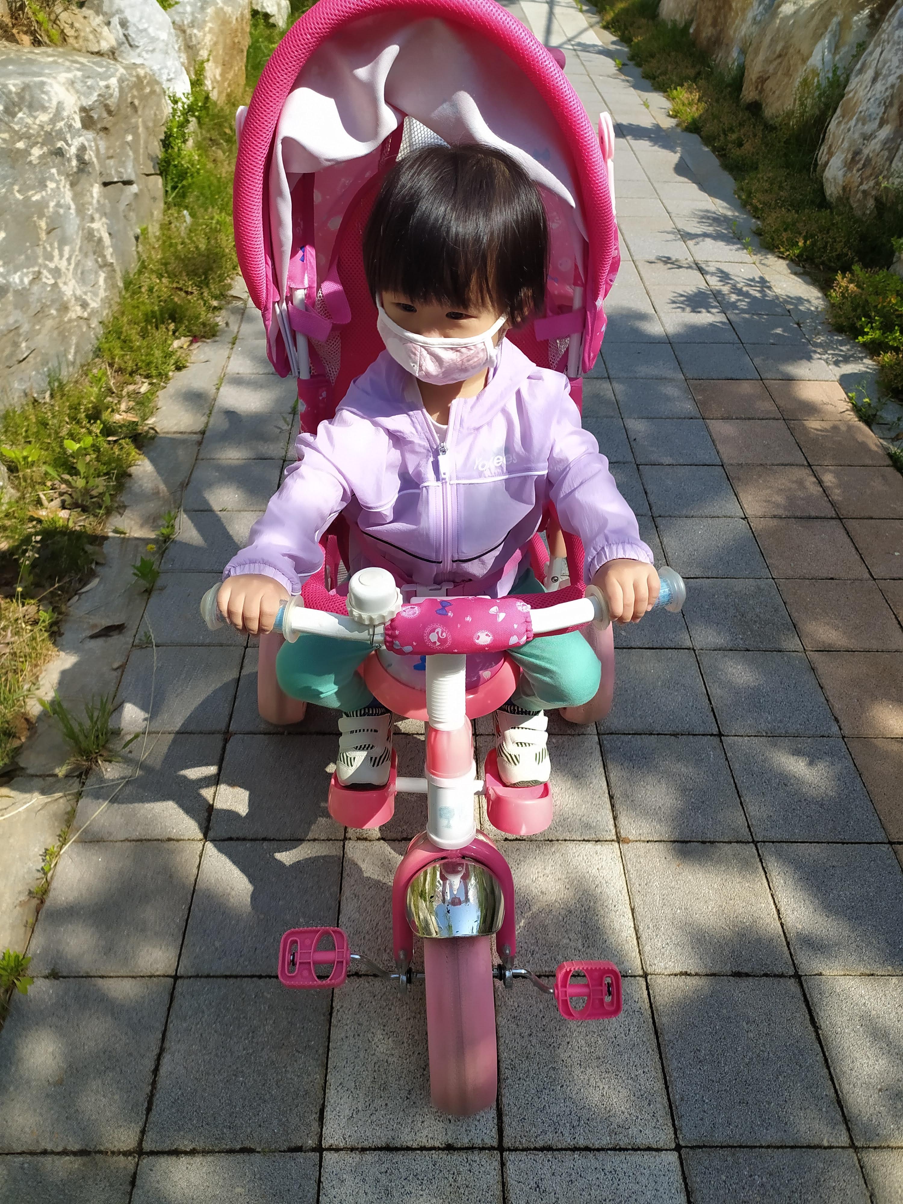 아빠가 뒤에서 밀어주는 자전거를 타고 제법 자세를 잡고 즐기고 있어요~
