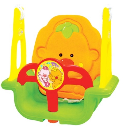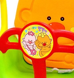그네 앞쪽 원형 부분을 손으로 탁탁 치면 멜로디가 나온다. (방귀대장 뿡뿡이 주제가)